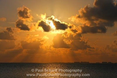 A cloudburst is, by definition, a short rainfall that lasts only a few minutes, but is intense enough to create minor flood conditions. In Guadaloupe in 1970, there was a one-minute cloudburst that dropped 1.5 inches of water. But when I saw this scene of the sun rising over the ocean, I thought this was a perfect alternative definition for the phrase, cloudburst. For more pictures of sun and clouds, visit Paul Scharff Photography.com.